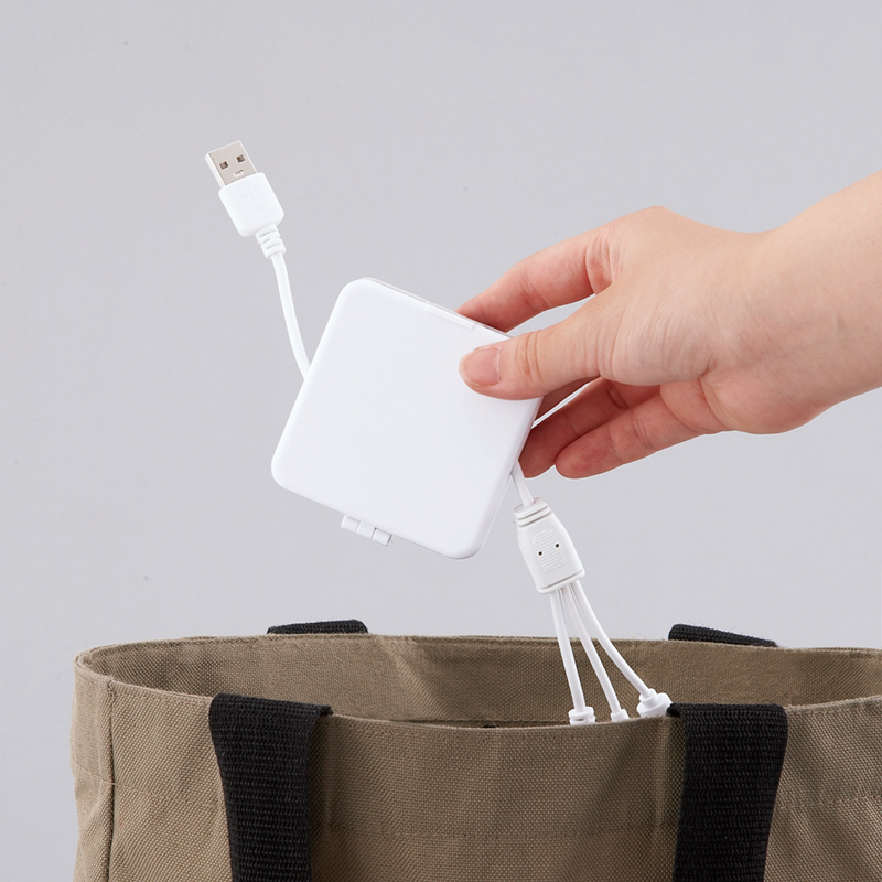 3種のUSBコネクタ付きケーブルがセットになったケーブルホルダー。スマホスタンドにもなり、動画視聴等にもぴったりです。